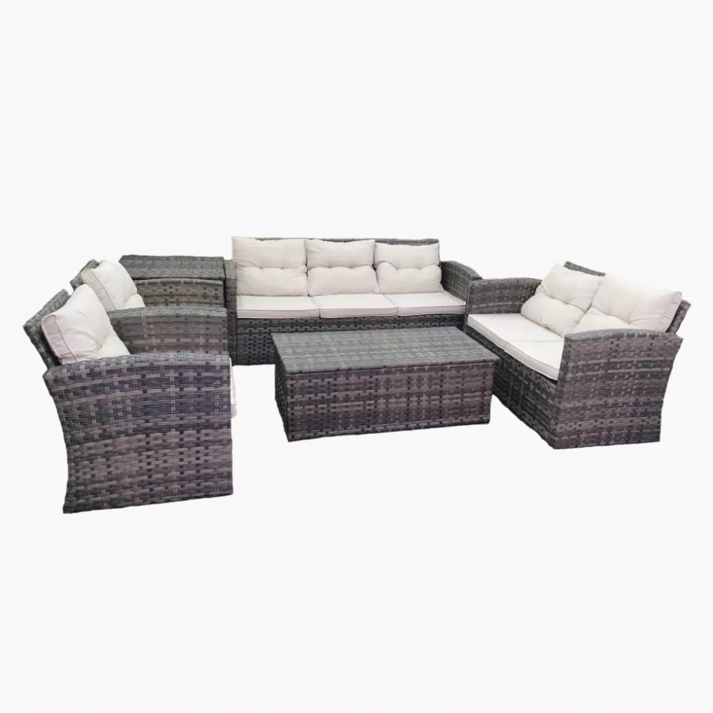 Create the perfect outdoor lounging space with this stylish rattan garden furniture set. Complete with cushioned armchairs, a cozy corner sofa, a coffee table, and a matching storage box, this set is built for comfort and functionality. The neutral tones and woven design add a relaxed, modern vibe to any patio, balcony, or garden setting.